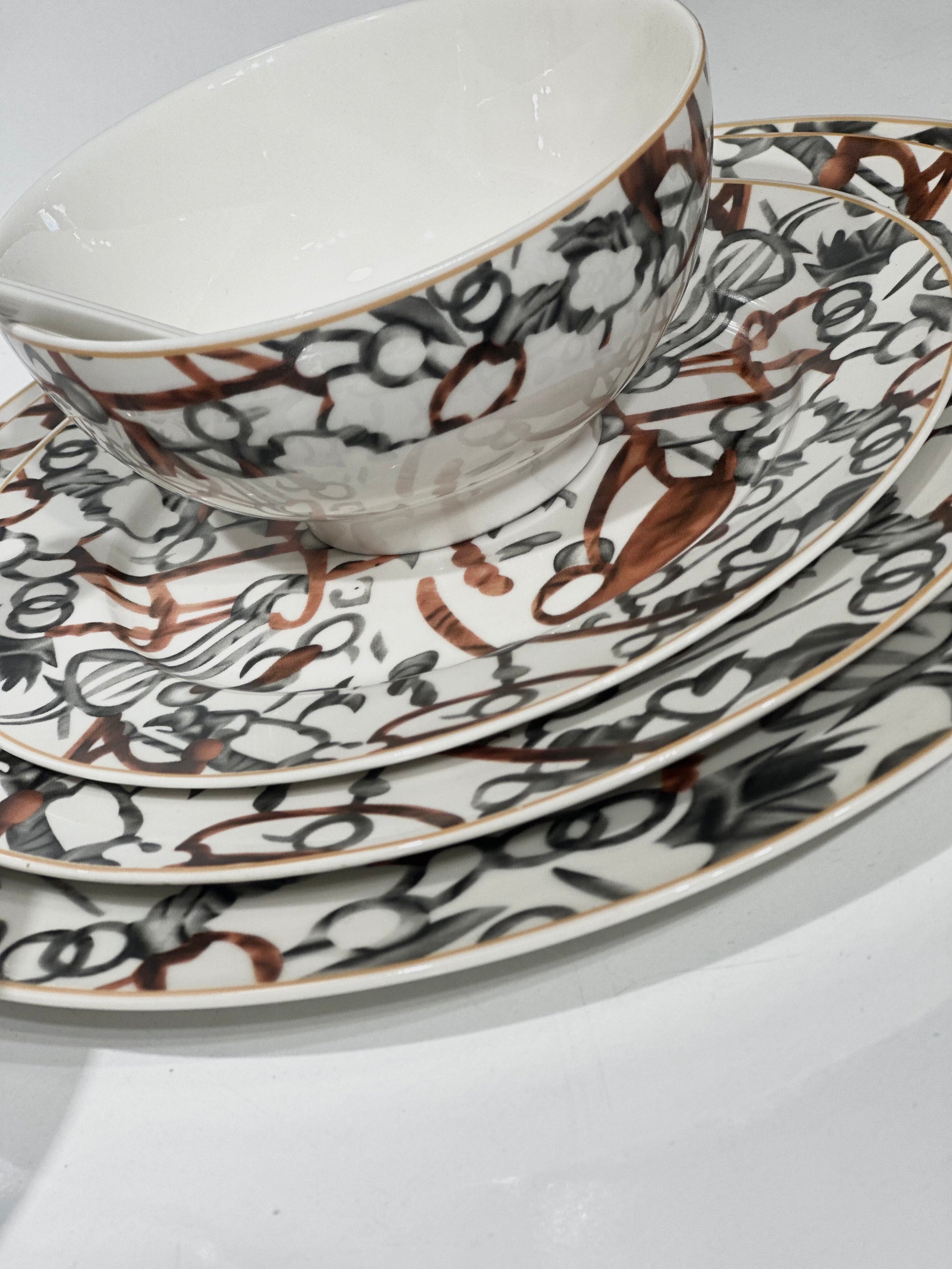 Service de Table 33 Pièces en Porcelaine – Blanc avec Décorations Marron et Gris